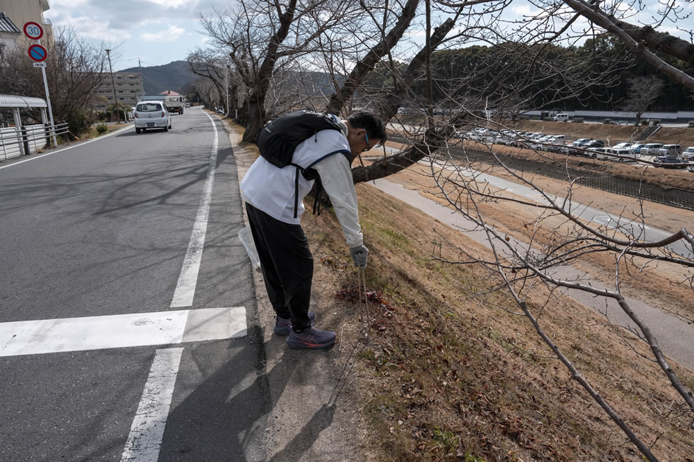 岡山市から提供いただいた指定の袋“ボランティア袋”とトングを手に一斉にゴミ拾いをスタートしました。