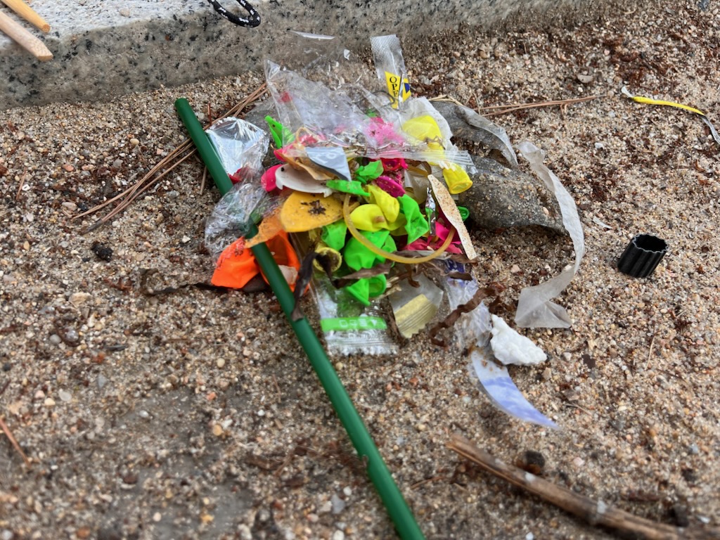 回収したゴミの中でもプラスチックごみが一番多かったです。ストロー、お菓子の包装ビニール、輪ゴム、水風船の残骸、タバコの包装ビニール、全てが我々の生活やレジャーで出てくるゴミです。