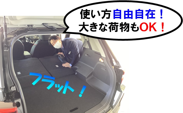 後席シートを倒すと大容量スペースが現れます!いろんな使い方がイメージできますね。