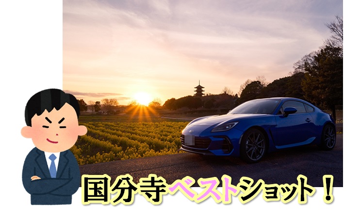夕日と五重の塔をバックにSUBARU BRZは萌えますね!
