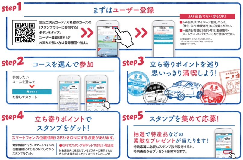 ①ユーザー登録~②コース選び~③立ち寄りポイントめぐり~④立ち寄りポイントでスタンプをゲット~⑤応募