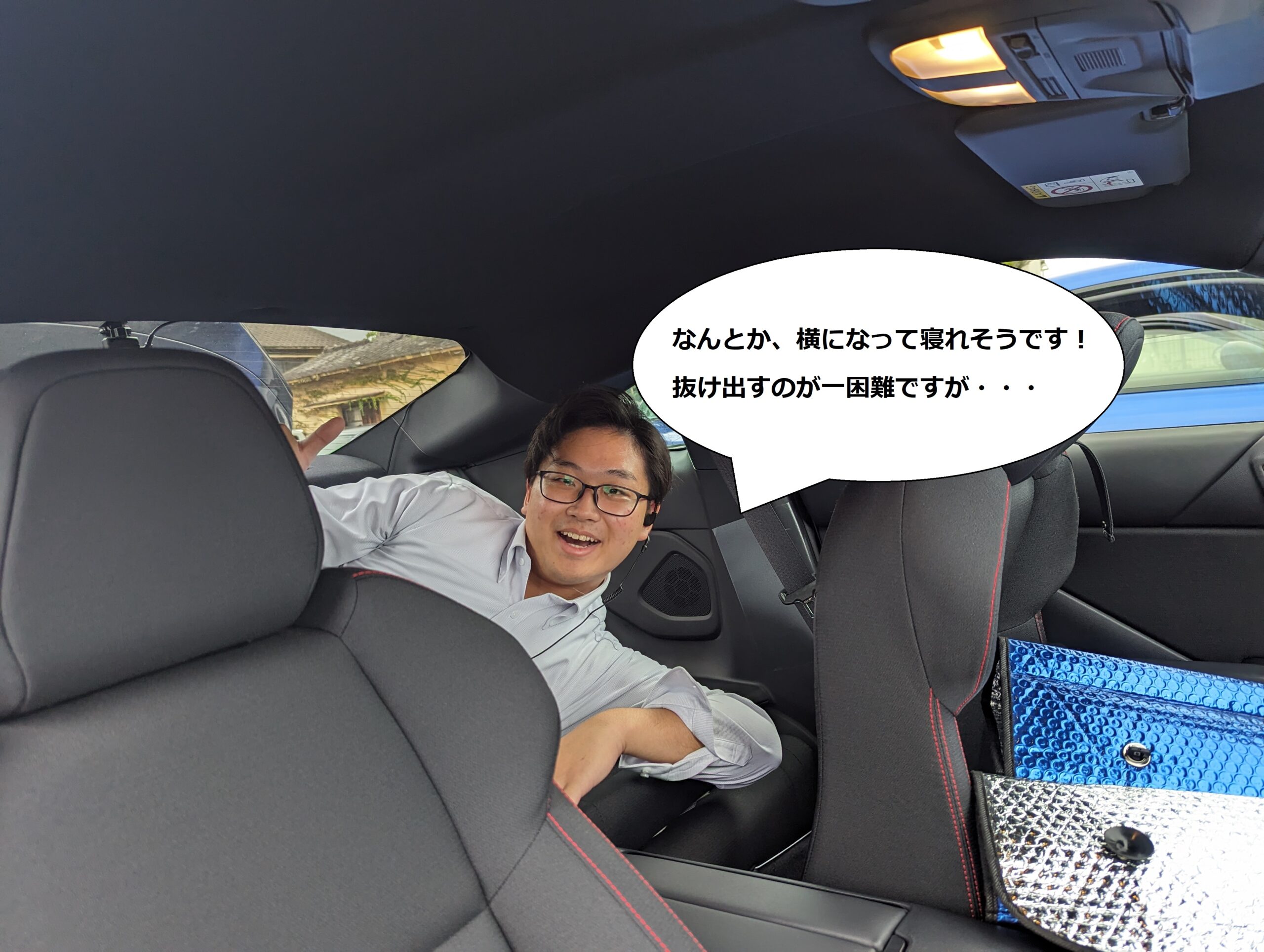 すがBRZではあきらめる必要があると思ってました・・・しかしなんとか、車中泊できるスペースがある!ということがわかりました!」