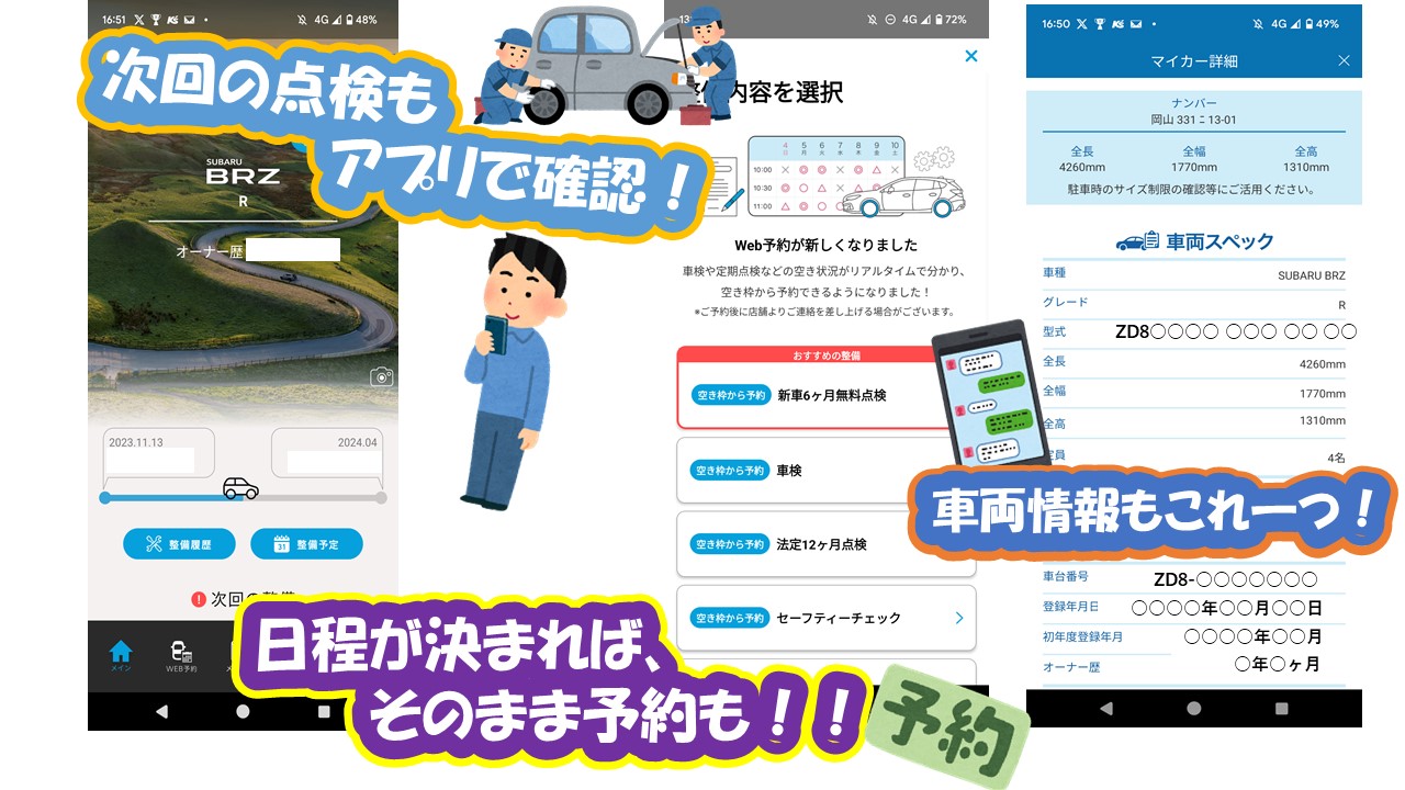 続いて、アプリ内で「マイカー詳細」と「整備履歴」が見られます!