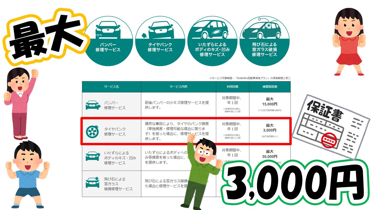 3000円まで負担してくれるので、大森CAは費用0円でパンク修理ができたの