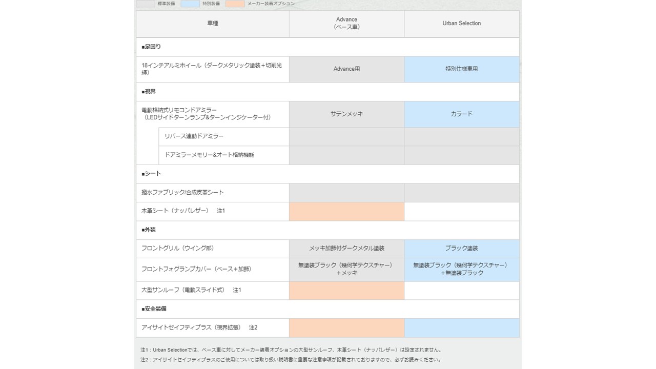 Advanceグレードをベースとしておりまして、変更点は以下の通りとなっております!