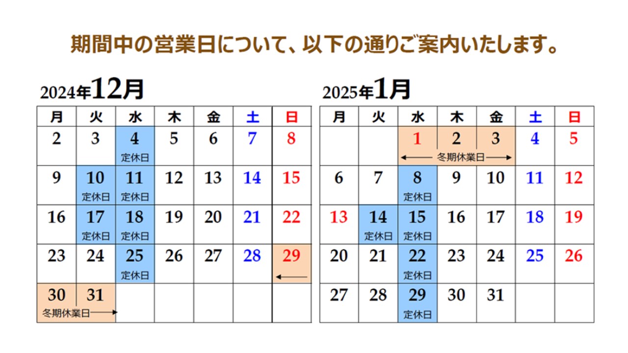 下記の期間中、誠に勝手ながら冬季休業を頂きます。