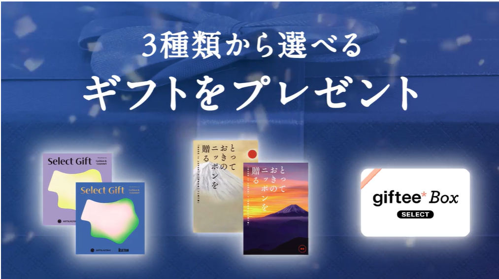 ご成約でカタログギフト2種とデジタルギフト1種の3つのギフトからお好きなものをおひとつお選びいただけます。