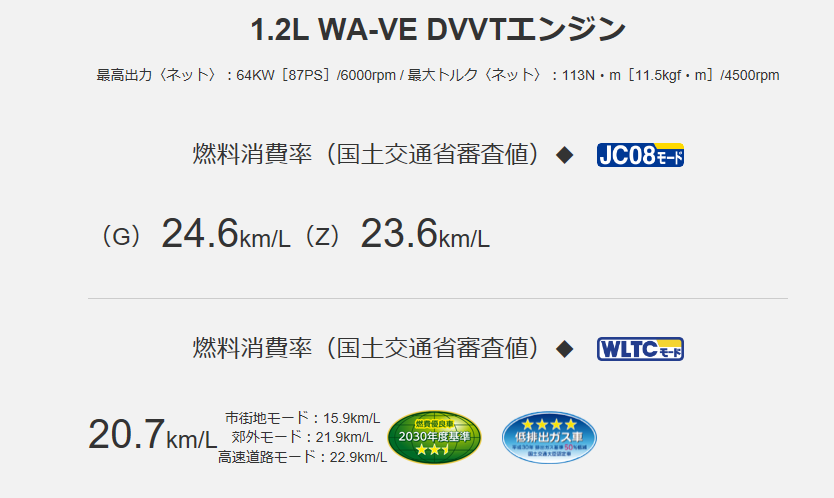 パワートレインについては、優れた動力性と低燃費を兼ね備えた軽量コンパクトな1.2LのWA-VE DVVTエンジンを搭載しております。出力性能と燃費のバランスが優秀で、出足のなめらかな加速が特徴的です。アクセルに対するリニアな加速感やレスポンスの良さなどを感じることができ、思い通りの走りが愉しめます。燃費も非常に優秀な平均20.7km/Lと経済的にもやさしい1台です。