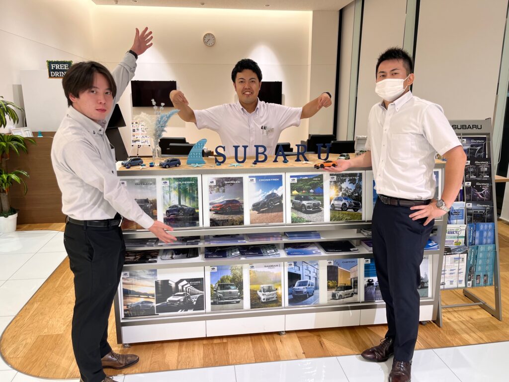 カタログ棚の上部を砂浜を意識した夏を感じる風景に変更しました。僭越ながら私渡邊、「SUBARU」の文字を青色に塗装させていただきました。