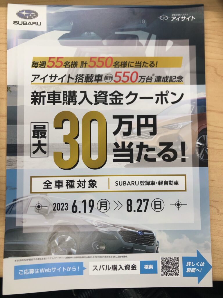 また、2023年8月27日(日)まで、アイサイト搭載車 累計550万台達成記念 購入資金クーポン最大30万円キャンペーンを行っております。店頭に応募概要の資料はご準備しておりますが、こちらにアップしておきますので、是非ご応募なさってください。