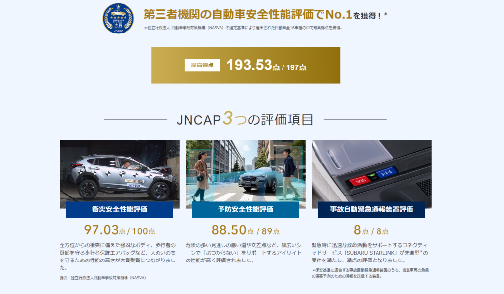安全に定評のあるスバルですが、自動車の安全性能に関する様々な評価試験を行い、その結果を公表する自動車アセスメントにおいて、インプレッサとクロストレック「ファイブスター大賞」に輝きました。