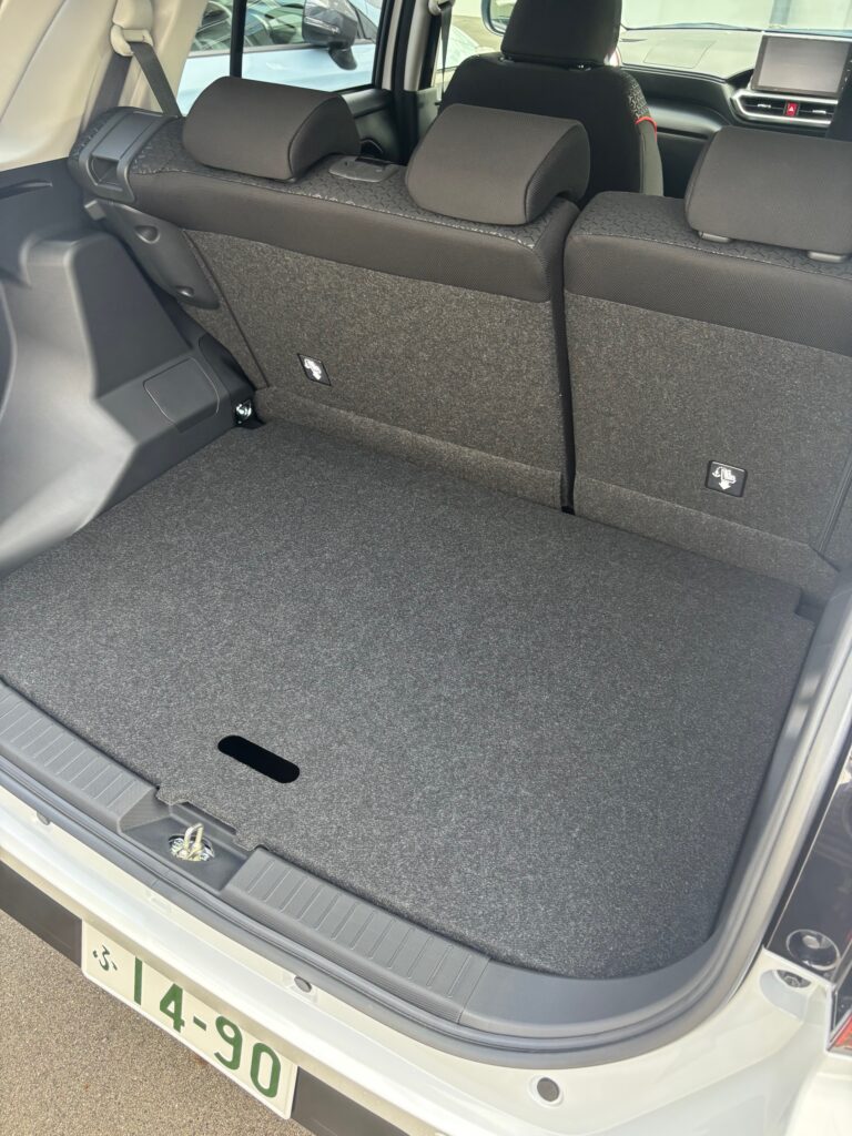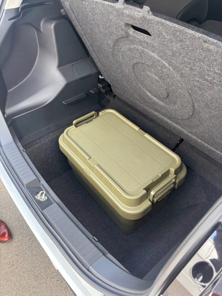 ボディサイズはコンパクトですが、室内の広さや、荷室も十分な容量を備えています。特に、荷室床下に関しては広大なサブトランクがありますので、遠出や、出先でのお買い物の品が、これでもかというくらい収納出来ます。写真では幅60センチ、高さ35センチ程のボックスが床下に収納できるサイズです。今回は小椋CAに協力を仰ぎ実演してみています。これだけの広さなら、普段使わないものや、備えておきたいものが十分に収まります。