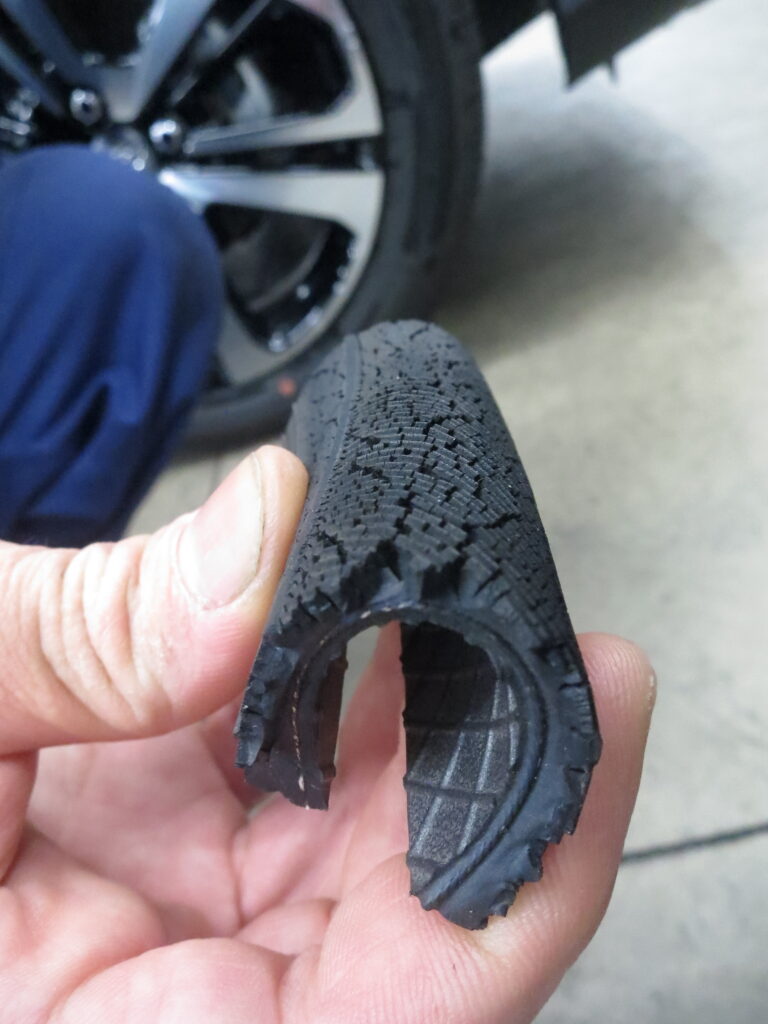 まずは溝! (左)しっかり使ったタイヤ (右)新品タイヤ