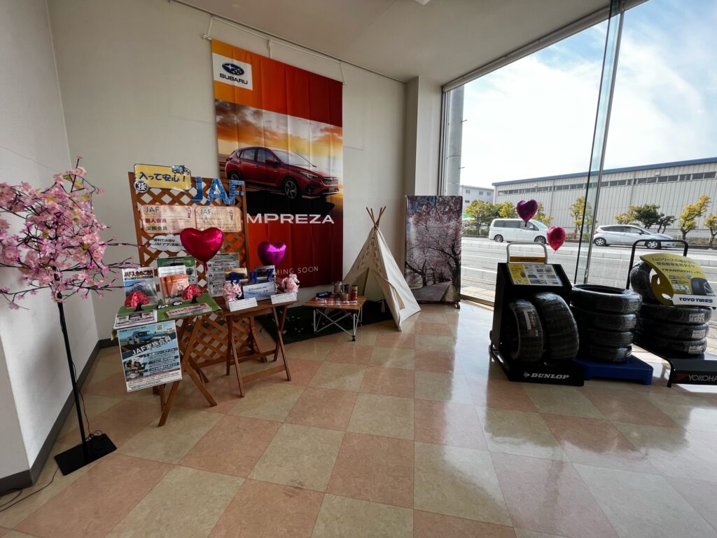 ショールーム奥にタイヤやJAFコーナーを設置して桜を少々(^^)/
