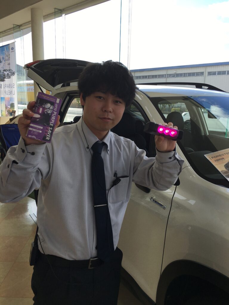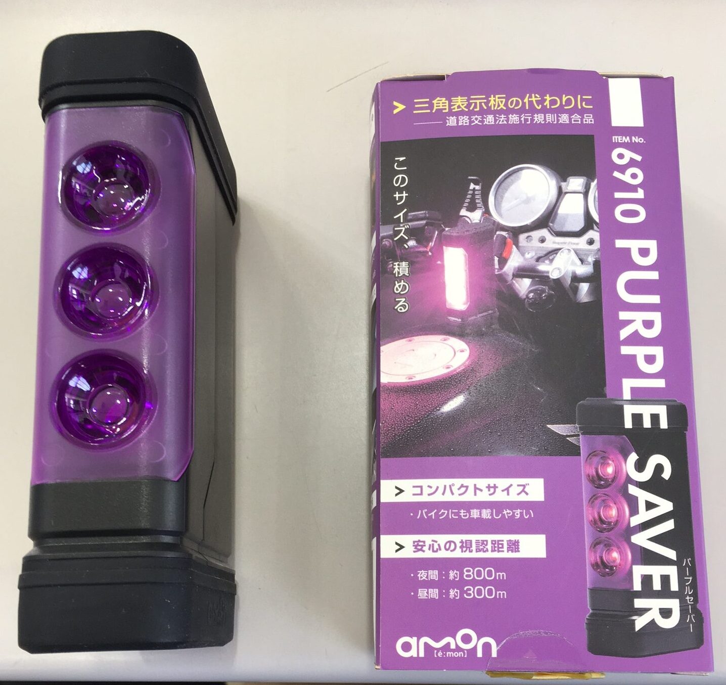 今回故障車には三角表示板が無かった為、秋元の車に車載の三角表示板と、藤田店に展示をしているPURPLE SAVERを使い警察がくるまで対応し、無事レッカー搬送されていきました。