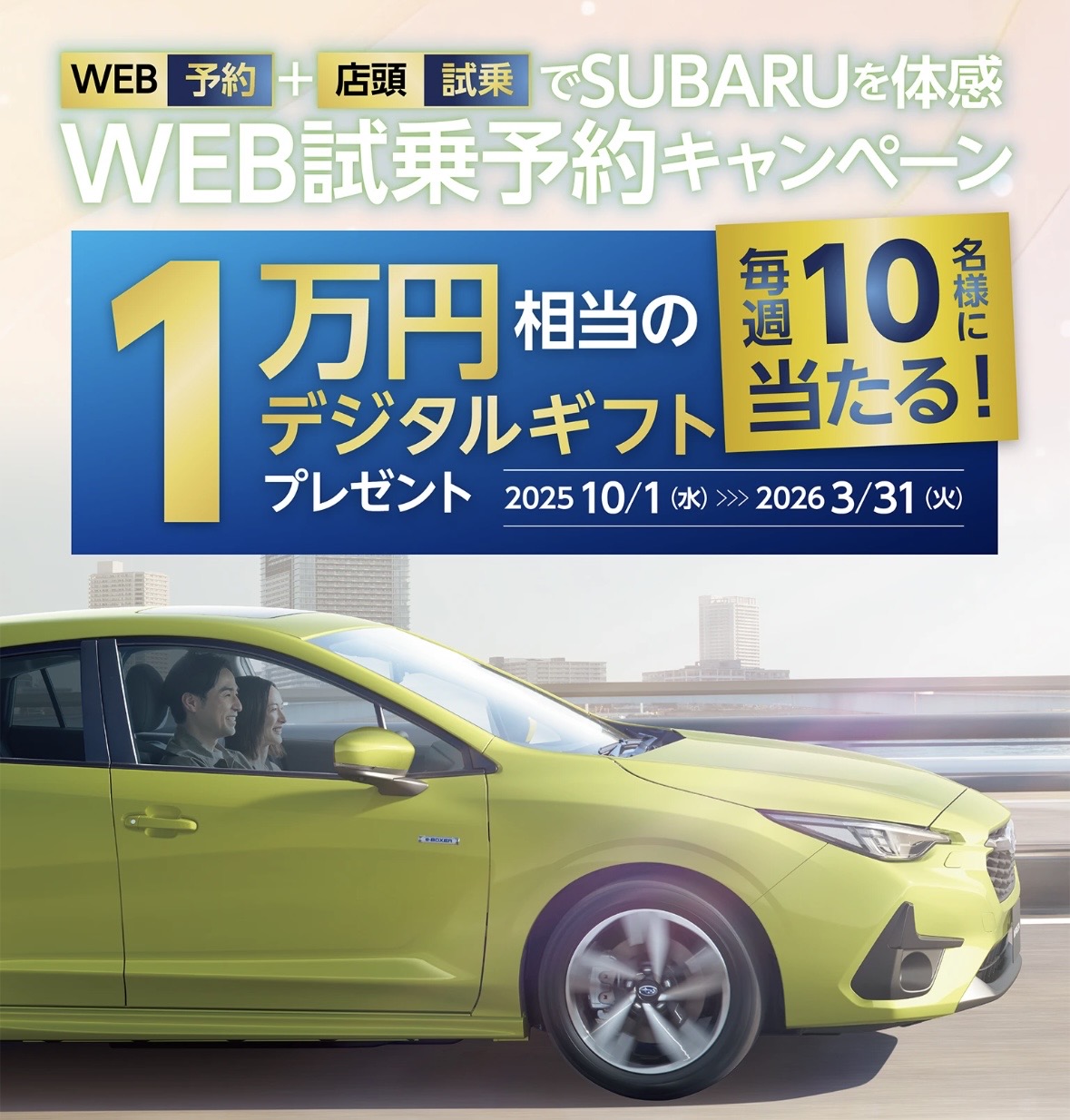 10/1(水)~3/31(火)までの期間では、Web予約+来店で試乗をご利用で、1万円分のデジタルギフトが当たるキャンペーンを行ってますので、是非ご活用くださいね![]()