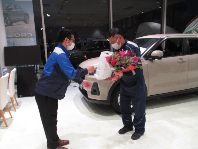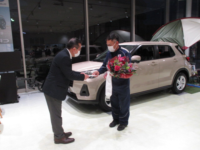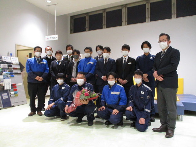 大島店スタッフ一同からのプレゼントを代表して河村店長に渡していただきました。