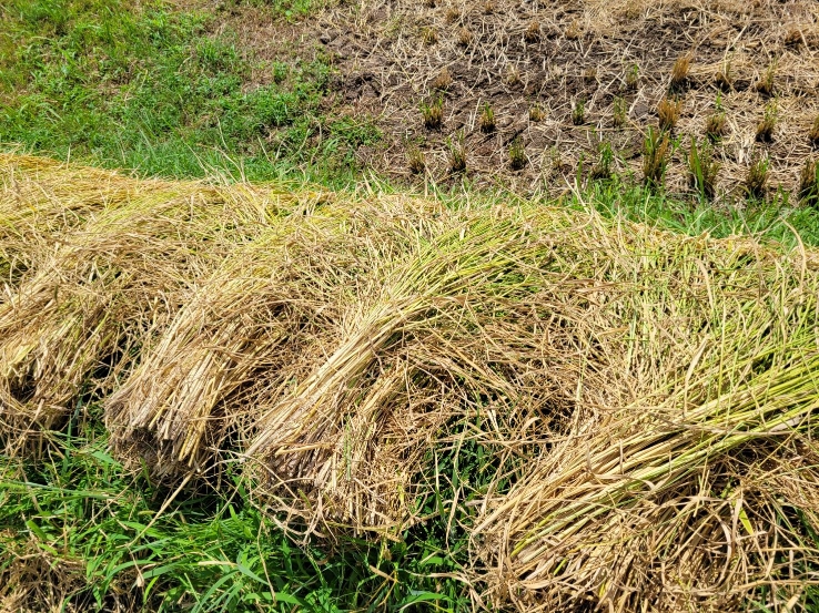 簡単に工程を説明すると、まずは四隅を人力で刈り、その後コンバインで一気に刈っていきます。