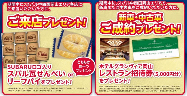 期間中、ご来店いただいたお客様に、スバル瓦せんべい or スバルリーフパイをプレゼント!