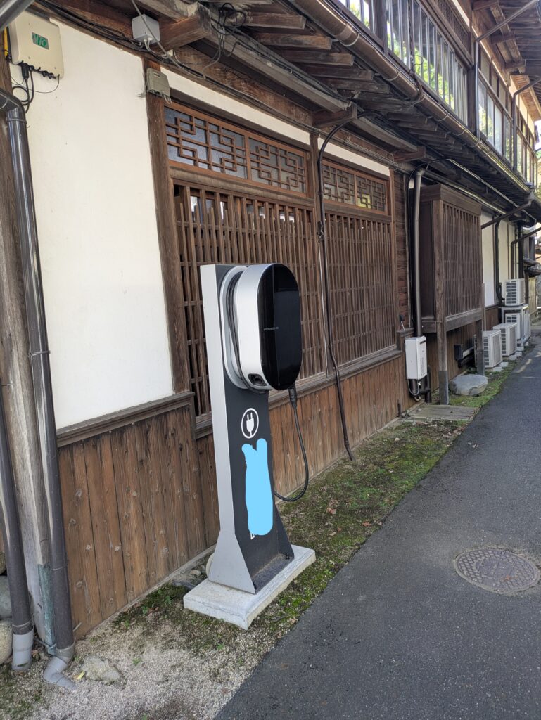 雰囲気の良い、温泉街の中に溶け込むように充電スポットが。