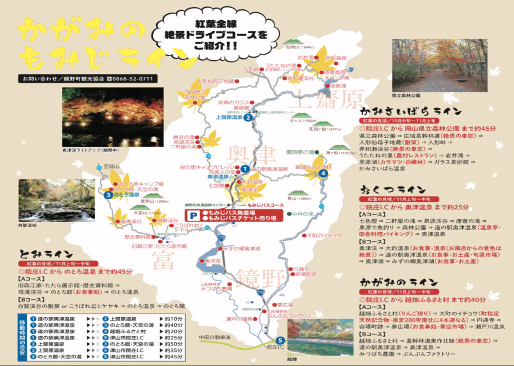 2022年10月29日(土)~11月13日(日)の期間は「奥津もみじ祭り」が開催されます。詳しくは鏡野町のHPを参照してください。