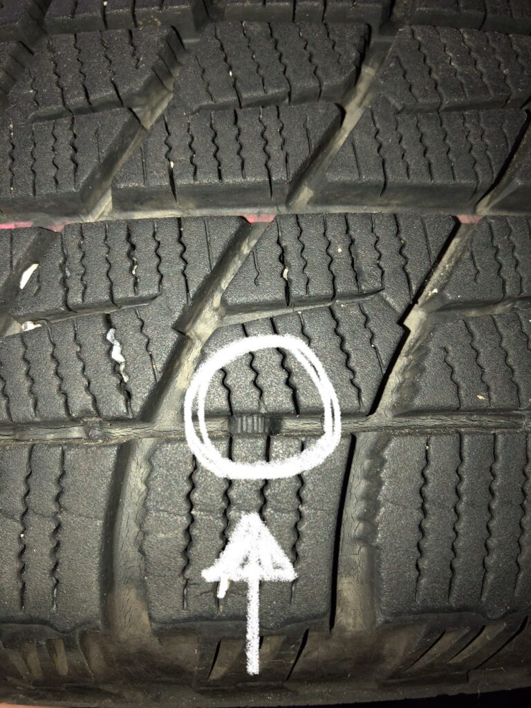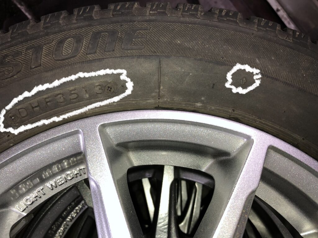 今お使いのタイヤの側面を今一度ご確認ください。(白〇2か所)
