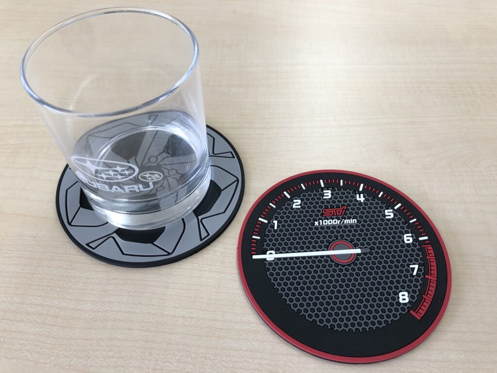 コースターはSTI Sportのホイールのデザインと、タコメーターのデザインの2種類がセットになっております。(注 グラスは付きません。(-_-;) )