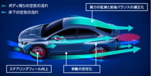 フロントフェンダーおよびリヤバンパーの後部にダクトを配し、ホイールハウスやリヤバンパー内で溜まる空気を積極的に排出して揚力や乱流(空気抵抗をおおきくしてしまうもの)の発生を抑制。高速走行時に上下左右の揺れを低減して操縦安定性向上に効果を発揮します。