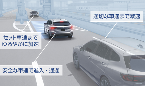 料金所の手前で、ETCゲートを安全に通過できる速度まで減速。通過後はセット車速まで加速します。