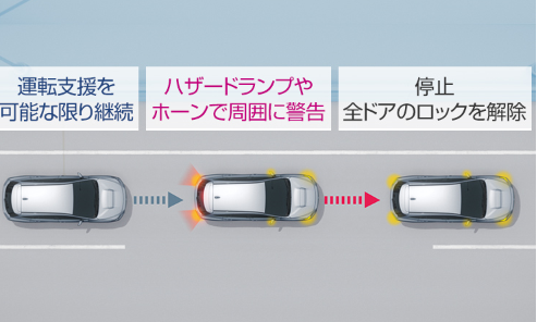 ツーリングアシスト作動中に長時間ステアリングから手を放しているとシステムが判断した場合や、渋滞時ハンズオフアシスト作動中に脇見や居眠りを検出した場合に、警告を行います。それでもステアリングを握らないことが続いた場合は、ドライバーに異常が発生したと判断。徐々に減速・停止し、ハザードランプやホーンで周囲に知らせます。