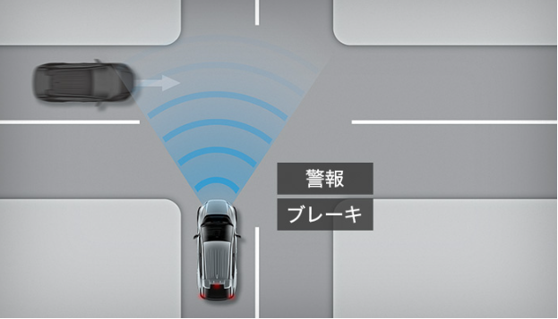 全側方ミリ波レーダーを搭載。見通しの悪い交差点などで全側方から接近する車を検知して、警告音やメーター画面の表示でドライバーにお知らせします。