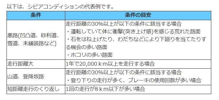 シビアコンディションにあてはまるお車は、通常の点検整備時期より早めに点検・交換することが必要です。