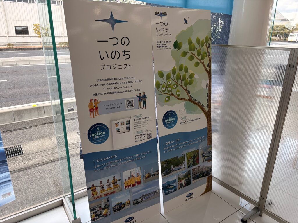 スバルでは「1つのいのちプロジェクト」を進めており、木の葉シールを張って緑いっぱいの大きな木をお客様と育てております。