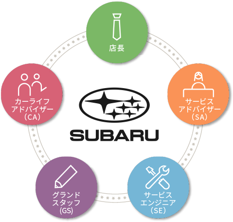スバル中四国ではカーライフアドバイザー、サービスアドバイザーなど、役割を持つスタッフ一人ひとりがSUBARUの顔として、